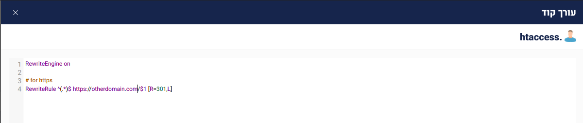 ה. פתחו את הקובץ לעריכה על ידי לחיצה עליו והכניסו את הקוד הבא, כאשר במקום otherdomain.com הכניסו את כתובת הדומיין אליו תרצו שהוא יבצע הפנייה: